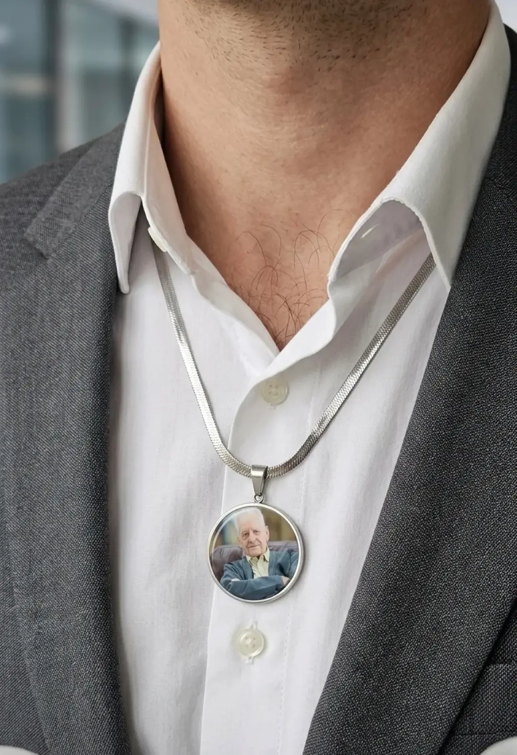 Fotoğraflı Gümüş Renk Burgu Zincir Çelik Kolye